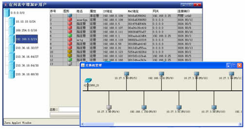 · 面向用户的图形管理,拓扑图可自动发现包括用户计算机在内的全部网络交换设备、路由器、服务器、链路、防火墙IDS设备、可网管UPS … … 等等 。对PC 机的当前连网状态及当前上网访问信息可进行实时检测。